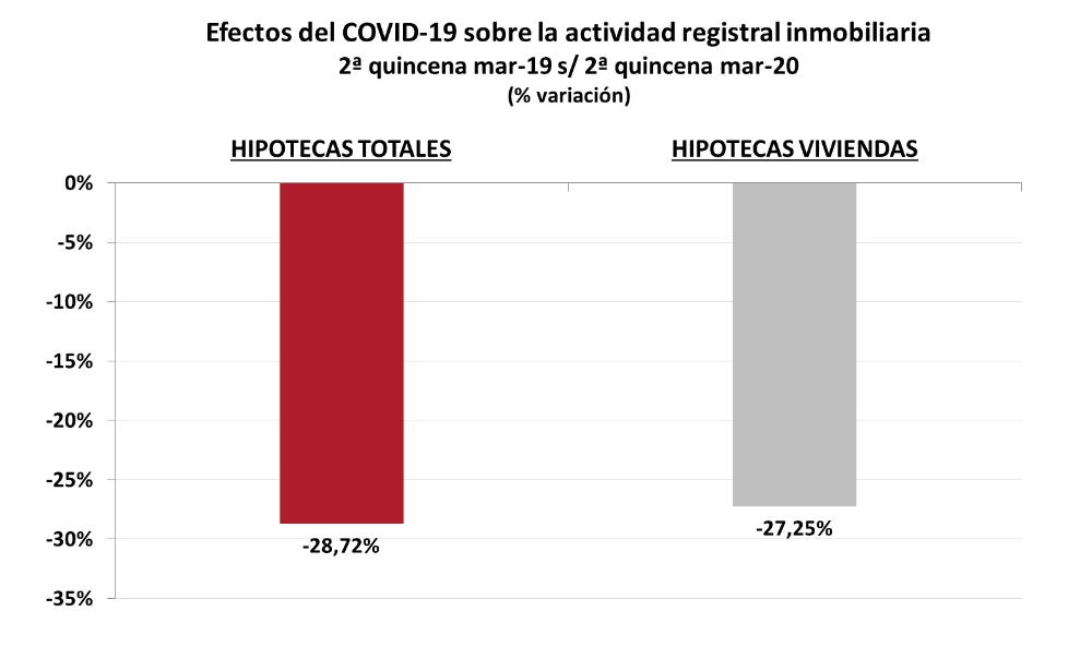 Si observamos la financiación, el número de hipotecas constituidas mediante su inscripción registral durante la segunda quincena de marzo, período inicial del estado de alarma, descendió significativamente, el 27,3% las hipotecas sobre vivienda y una cifra similar, el 28,7%, las hipotecas sobre el total de fincas.