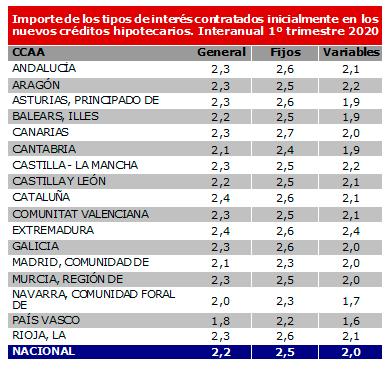 Las comunidades autónomas con menores cuantías medias para el total general han sido País Vasco (1,8%), Comunidad Foral de Navarra (2,0%) y Comunidad de Madrid (2,1%), mientras que los mayores tipos de interés medios se han registrado en Extremadura (2,4%), Cataluña (2,4%) y Andalucía (2,3%).