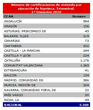 - En el primer trimestre del año se han registrado 5.508 certificaciones de vivienda por ejecución de hipoteca