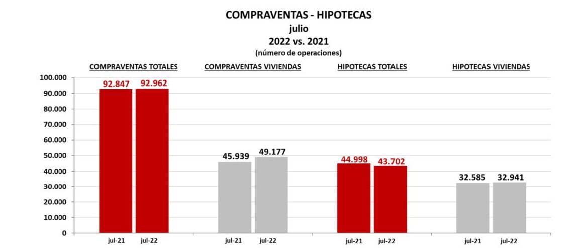 Con relación al número de compraventas totales en julio, respecto al mismo periodo del año anterior, se produce la mayor ralentización del crecimiento de los últimos meses, que viene precedida de una moderación del crecimiento en el mes de junio. De las 92.847 operaciones realizadas en julio de 2021, se pasaron a las 92.962 en julio de este año, cifra prácticamente igual a la de un año antes.