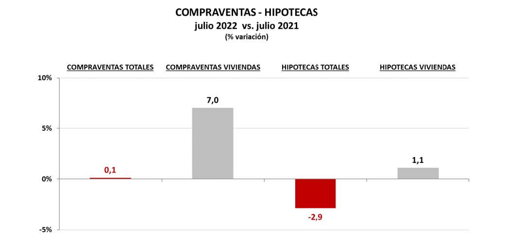Por último, el análisis mensual de la evolución anual de compraventas e hipotecas totales en los registros de la propiedad durante los últimos doce meses, de agosto de 2021 a julio de 2022, mediante la comparación con el mismo mes del año anterior, muestra los siguientes resultados: