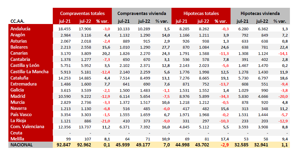 Con relación a la evolución anual de las compraventas totales por Comunidades Autónomas, se observan descensos en diez territorios. Entre las cuatro Comunidades con mayor volumen, descienden en Madrid (-12,9%) y Andalucía (-3,0%), y se incrementan en la Comunidad Valenciana (11,2%) y Cataluña (4,4%). En el resto destacan los crecimientos de Canarias (20,2%) y Baleares (15,6%) y en la parte negativa los descensos de La Rioja (-21,0%) y Castilla – La Mancha (-12,4%). Con relación a las hipotecas totales constituidas respecto a julio del año pasado, disminuyeron sobre todo en Madrid (-34,3%) y Extremadura (-13,7%). En la parte positiva, aumentaron más en Baleares (24,6%), Cataluña (19,1%) y Navarra (15,6%).