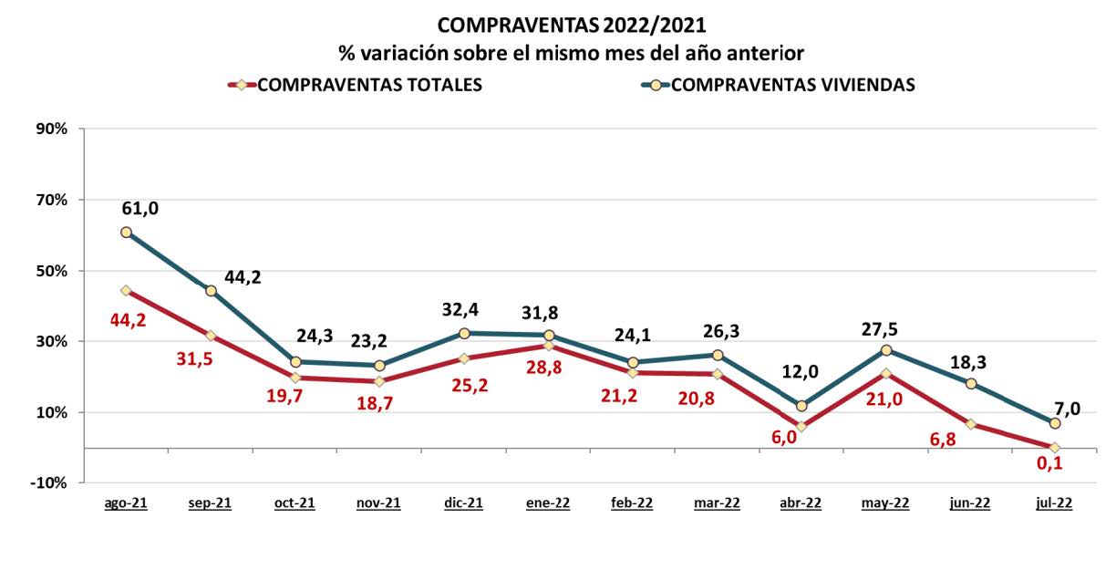 Las compraventas estaban experimentando importantes crecimientos anuales sostenidos, salvo en abril de este año, entre el 20 y el 30% mensual, desde octubre de 2021 hasta mayo de este año. En junio el crecimiento descendió de forma acusada sobre el mes anterior y este descenso tuvo continuidad en julio, dejando las compraventas totales casi sin crecimiento anual (0,1%) y ralentizando las de vivienda hasta el 7%, 11 puntos menos que el mes anterior.
