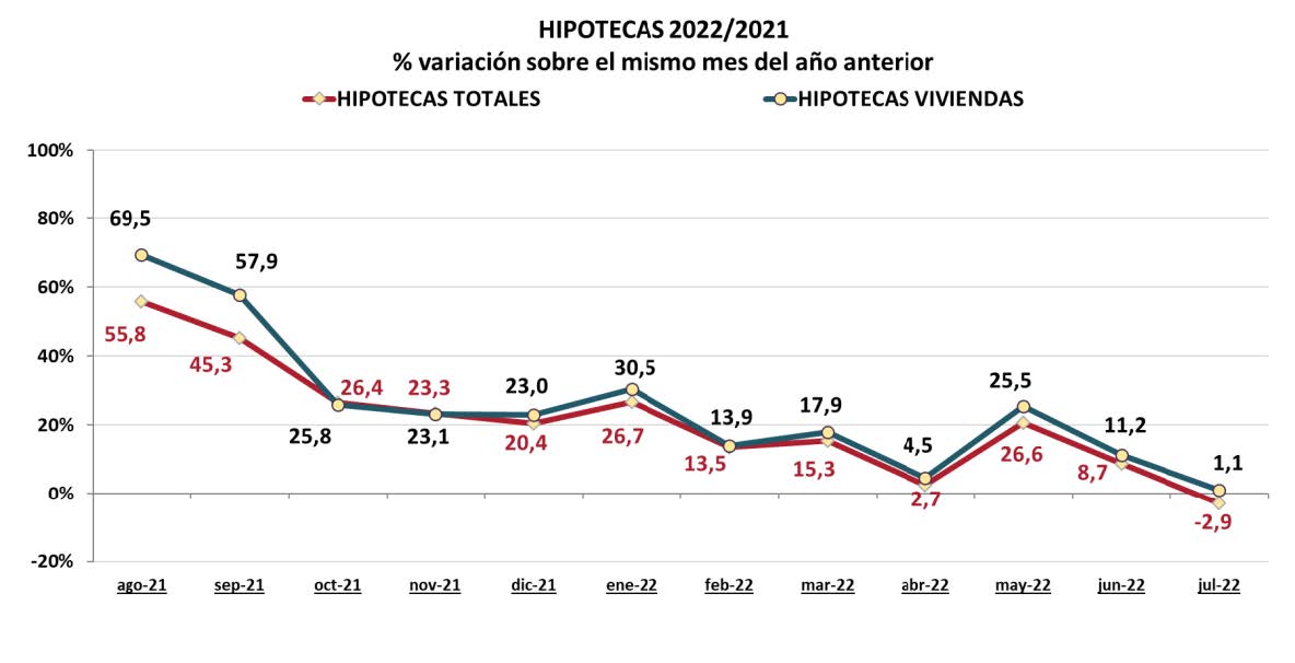 En cuanto a las hipotecas, también mostraban una línea general de importantes crecimientos anuales sostenidos (con la salvedad de abril), con un amplio abanico de crecimientos entre el 15% y el 30% mensual, desde octubre de 2021 hasta mayo de este año. En junio el crecimiento descendió de forma intensa sobre el mes anterior y este fuerte descenso continuó en julio, mostrando las hipotecas totales el primer descenso anual (-2,9%) desde hace casi año y medio. Las hipotecas inscritas sobre vivienda mantuvieron todavía un ligero crecimiento anual (1,1%), aunque descienden diez puntos sobre lo que se incrementaron en junio.