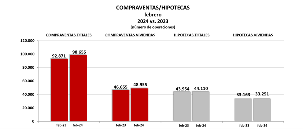 Si se mide la evolución mediante la tasa de variación de las compraventas inscritas en febrero de 2024 frente al mismo mes de un año antes se pueden precisar mejor los resultados. Las compraventas totales se han incrementado en febrero el 6,2%, mientras que las de vivienda lo hicieron el 4,9%. En cuanto a las hipotecas totales constituidas, se incrementaron el 0,4%, mientras las de vivienda lo hicieron de forma similar, incrementándose en un 0,3%.
