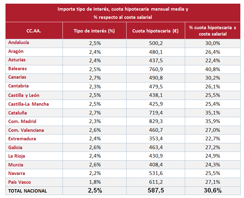 - La cuota hipotecaria mensual se sitúa en 588 euros y su porcentaje con respecto al coste salarial medio en el 30,6%