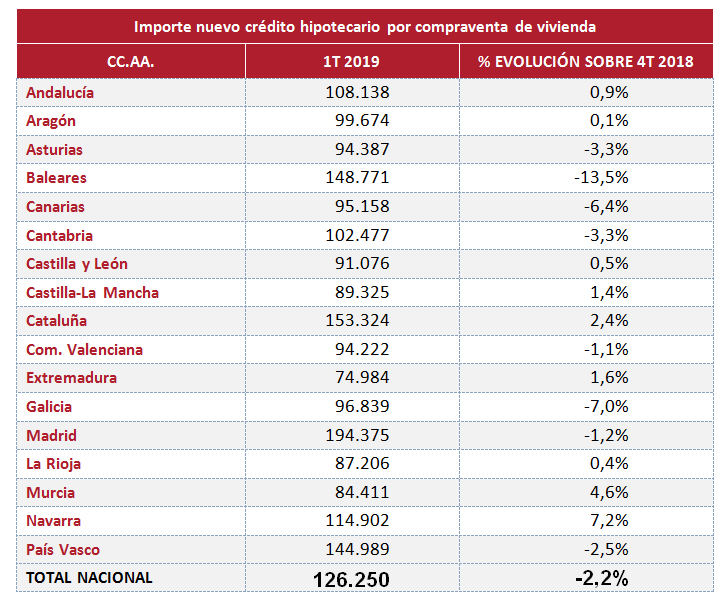 Según la estadística inmobiliaria del Colegio de Registradores correspondiente al primer trimestre, las comunidades autónomas con mayores niveles de endeudamiento hipotecario por vivienda durante el primer trimestre del año han sido Comunidad de Madrid (194.375 €), Cataluña (153.324 €), Baleares (148.771 €) y País Vasco (144.989 €). En el otro lado, las hipotecas de importes más reducidos se localizan en Extremadura (74.984 €), Murcia (84.411 €) y La Rioja (87.206 €).