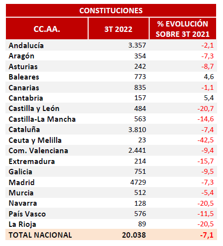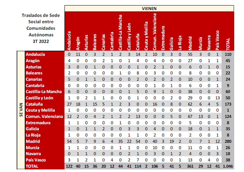 Se indican en la siguiente tabla los datos sobre los traslados de sede social entre las diversas CC.AA. relativas al tercer trimestre de 2022. Dichos movimientos no corresponden a solicitudes de traslado sino a confirmaciones de traslado inscritas en el registro de destino.