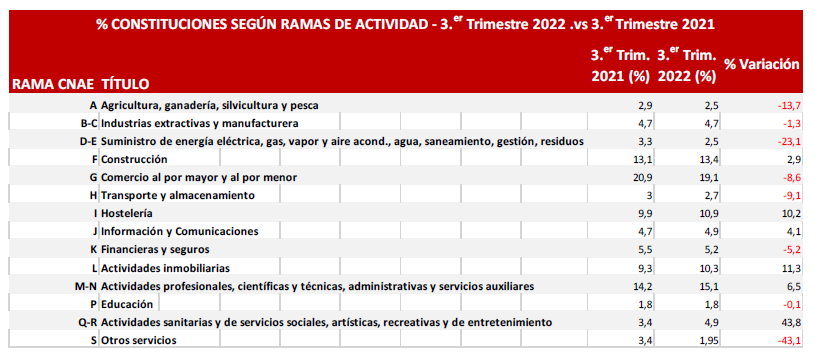 Analizando la proporción que tienen los diferentes sectores de actividad sobre los nuevos proyectos empresariales, se compara la dedicación actual de las empresas creadas con la dedicación de las que se creaban hace un año, mostrando la evolución de su peso relativo según ramas de la CNAE y durante el tercer trimestre de 2022, respecto al mismo de 2021.