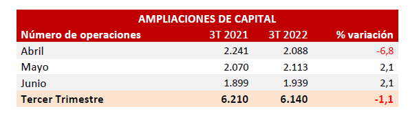 En el tercer trimestre se contabilizaron 6.140 ampliaciones de capital, con un suave descenso del 1,1% sobre el mismo periodo del año anterior. En términos de importe de capital aumentado se desembolsaron 4.019 millones de euros, con un descenso del 51,8% sobre el mismo período de 2021.