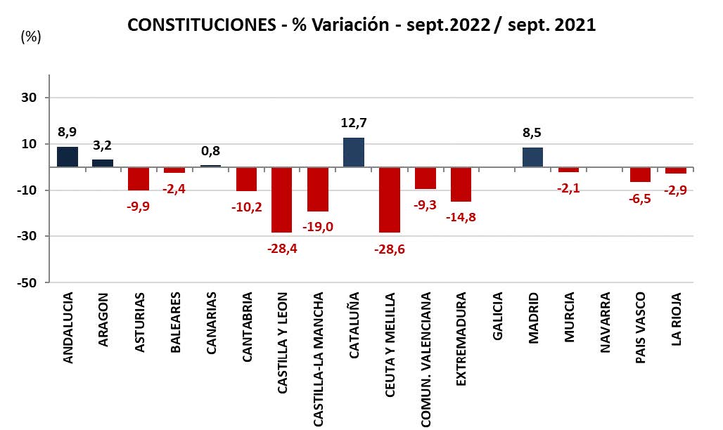 En cuando a la evolución de las constituciones, Desde el mes de abril se vienen produciendo resultados negativos hasta este mes de septiembre, que mejora la tendencia después de cinco meses consecutivos de caídas.