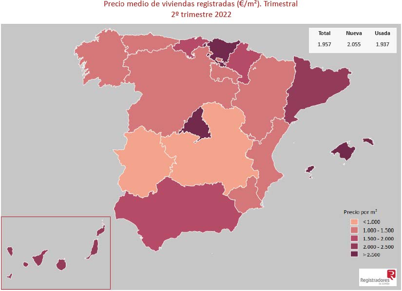 Por CC.AA., en el segundo trimestre, los mayores precios medios se localizaron en Baleares (3.180 €/m2), Madrid (3.169 €/m2), País Vasco (2.787 €/m2) y Cataluña (2.427 €/m2). En sentido opuesto, los precios más bajos se registraron en Extremadura (796 €/m2) y Castilla La Mancha (830 €/m2), únicas comunidades por debajo de los 1.000 euros por m2.