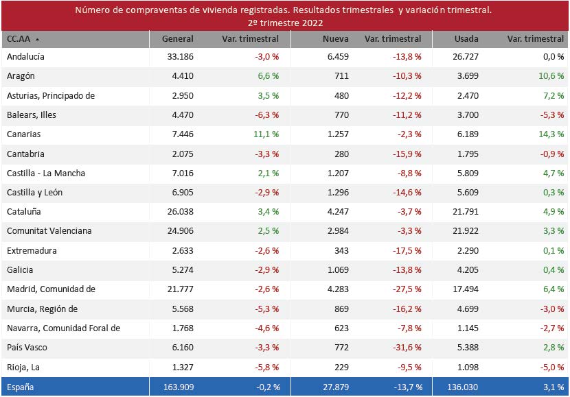 En vivienda nueva se han registrado 27.879 compraventas (un descenso del 13,7% sobre el trimestre anterior). La vivienda usada registró 136.030 operaciones, con un incremento trimestral del 3,1%.