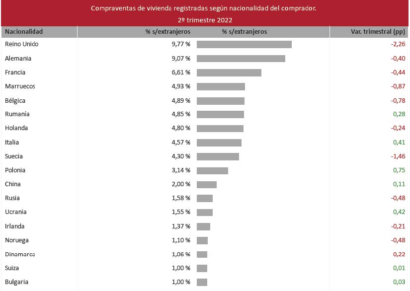 La demanda extranjera registra su nivel máximo de los últimos diez años. En el segundo trimestre ha alcanzado el 14,7%, con lo que se acumulan cinco trimestres consecutivos de crecimiento, superando el nivel del 13%, habitual en los últimos años. Los británicos vuelven a encabezar los resultados, con un 9,8%, seguidos por alemanes (9,1%), franceses (6,6%), marroquíes (4,9%), belgas (4,9%) y rumanos (4,9%).