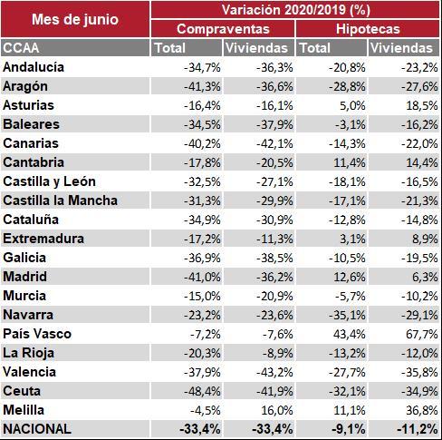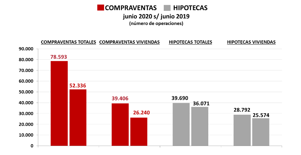 Con relación al número de operaciones realizadas, las compraventas totales pasaron de más de 78.000 en junio de 2019 a poco más de 52.000 en junio de este año. Las compraventas de vivienda pasaron de casi 40.000 operaciones el mismo mes del año pasado a poco más de 26.000 en junio de este año. Las hipotecas, al igual que los meses anteriores, tuvieron un resultado negativo aunque bastante más moderado, pasando las hipotecas totales desde casi 40.000 en junio del año pasado a poco más de 36.000 este mes de junio. Las hipotecas sobre vivienda registraron un descenso similar, desde las casi 29.000 de junio del 2019 a las más de 25.000 de junio de este año.