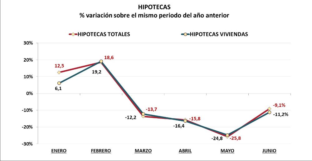 Por último, el análisis mensual de la evolución anual de compraventas e hipotecas en el Registro de la Propiedad durante los meses de enero a junio de este año, mediante la comparación con el mismo mes del año anterior, muestra los siguientes resultados: