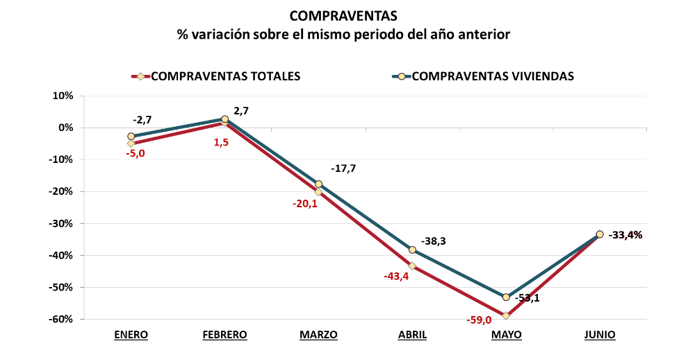 En el apartado de compraventas, tanto las totales como las relativas a vivienda, que comenzaron a caer en el mes de marzo, principio del estado de alarma, con caídas en el entorno del -20%, continuando su paulatina tasa de descenso hasta mayo, con tasas de variación superiores al -50% sobre el mismo mes del año anterior. En junio, comienza a invertirse la tendencia, reflejándose ya un descenso significativamente menor sobre junio del año pasado, con una caída de un tercio sobre el mismo período de 2019, afectando de forma similar a las compraventas totales y a las referidas a vivienda.
