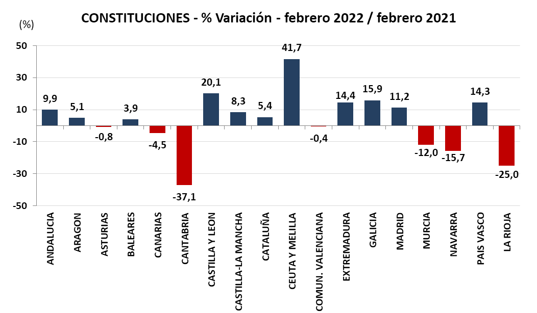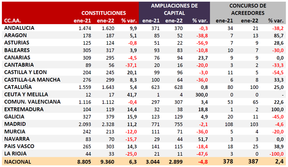En enero disminuyó la creación de empresas en cinco comunidades: Cantabria, La Rioja, Navarra, Murcia y Asturias. Los crecimientos más importantes se produjeron en las Ciudades Autónomas de Ceuta y Melilla, Castilla y León, Galicia y Extremadura.