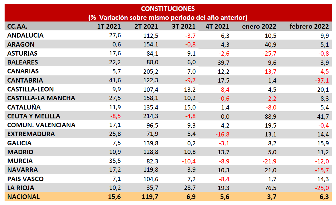 La evolución de las constituciones durante el mes de febrero continúa con datos positivos. Se crearon 9.360 empresas, un 6,3% más que en el mismo periodo de 2021. Los mayores volúmenes de empresas creadas correspondieron a Madrid, Cataluña y Andalucía, que conjuntamente constituyeron seis de cada diez empresas creadas.