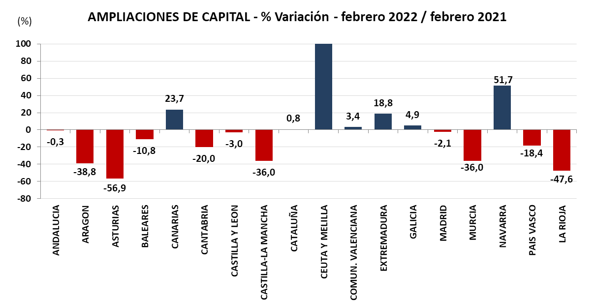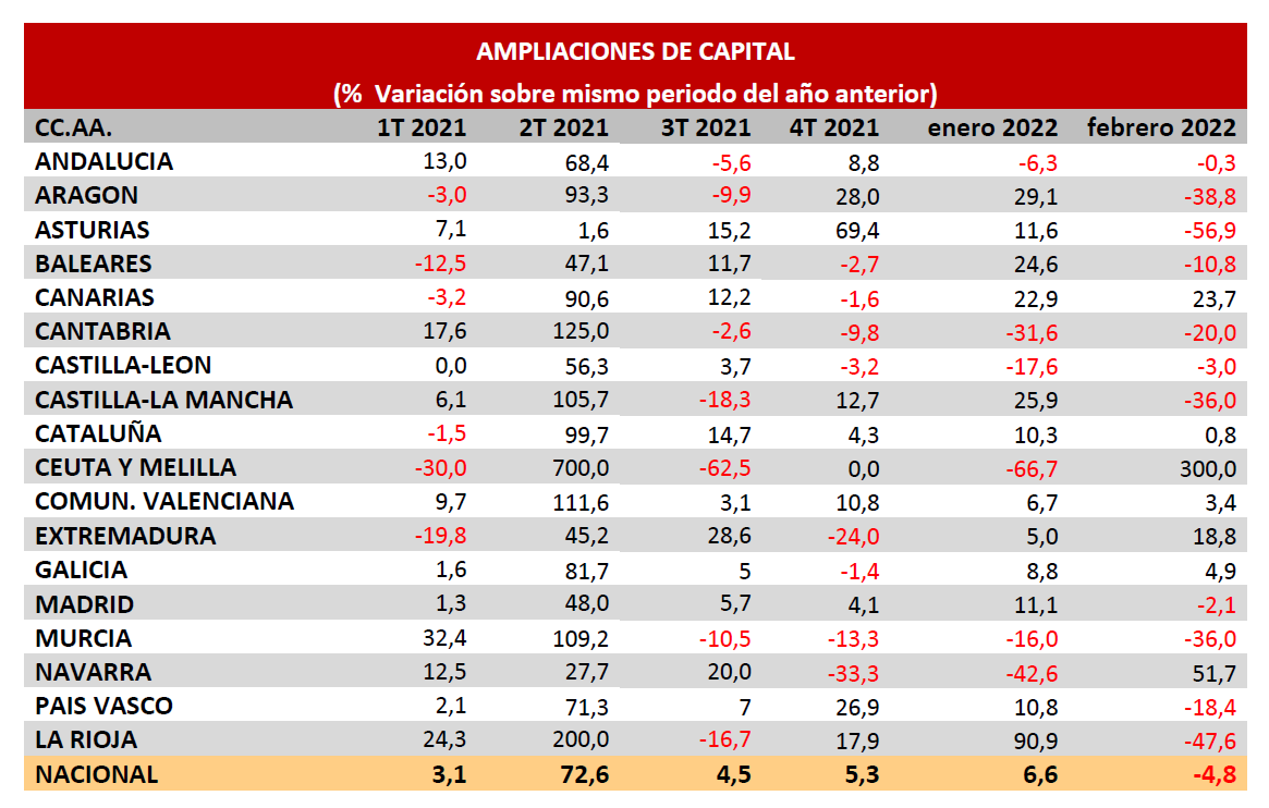 Las operaciones de ampliación de capital inscritas en los RR.MM. en los últimos meses mostraban una tendencia positiva similar a las constituciones, con tres meses consecutivos de incrementos. Pero en febrero, rompieron la tendencia, descendiendo el 4,8 % anual.