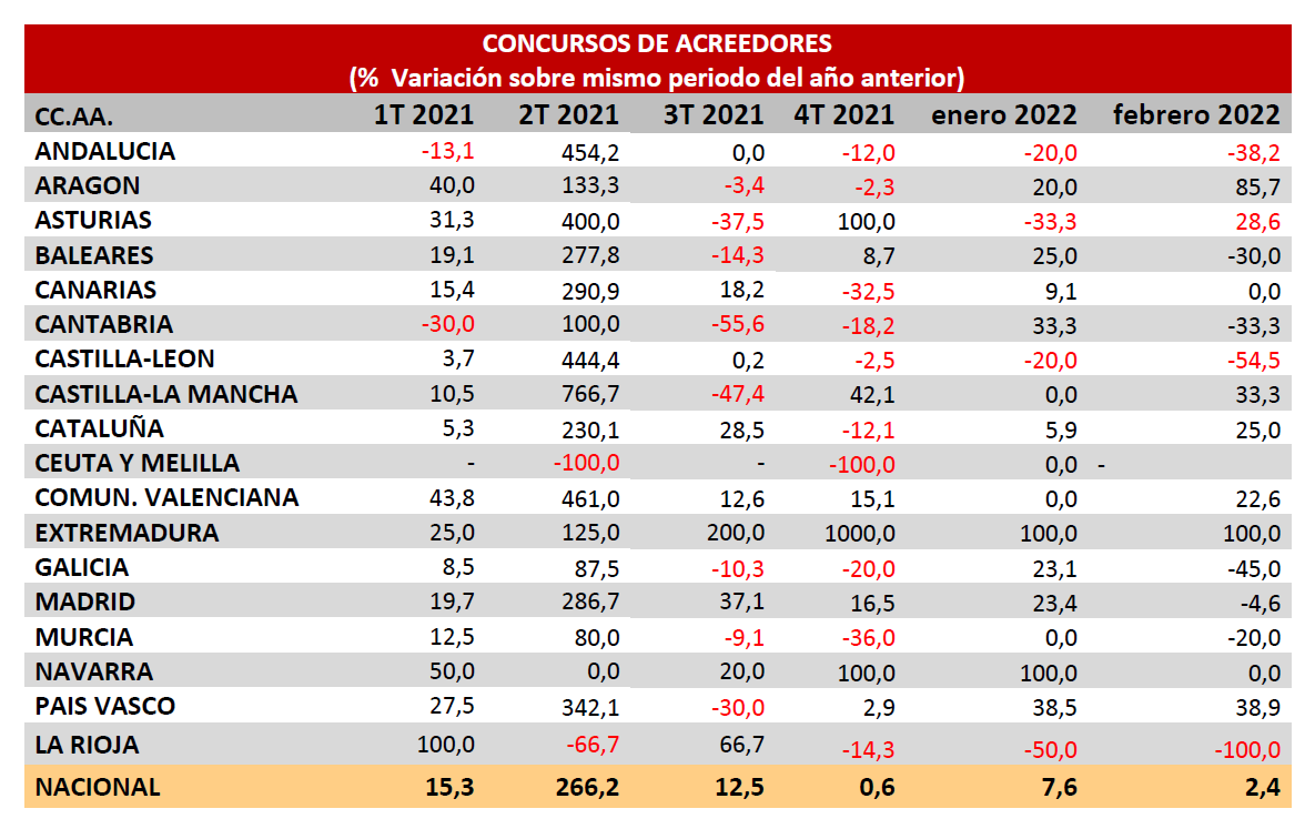 Después del brusco incremento del segundo trimestre de 2021, los datos negativos, con crecimiento desigual, se han moderado en febrero, hasta el 2,4% de aumento. Hasta la finalización de moratoria concursal vigente hasta junio, los concursos no podrán mostrar con precisión la tendencia real.
