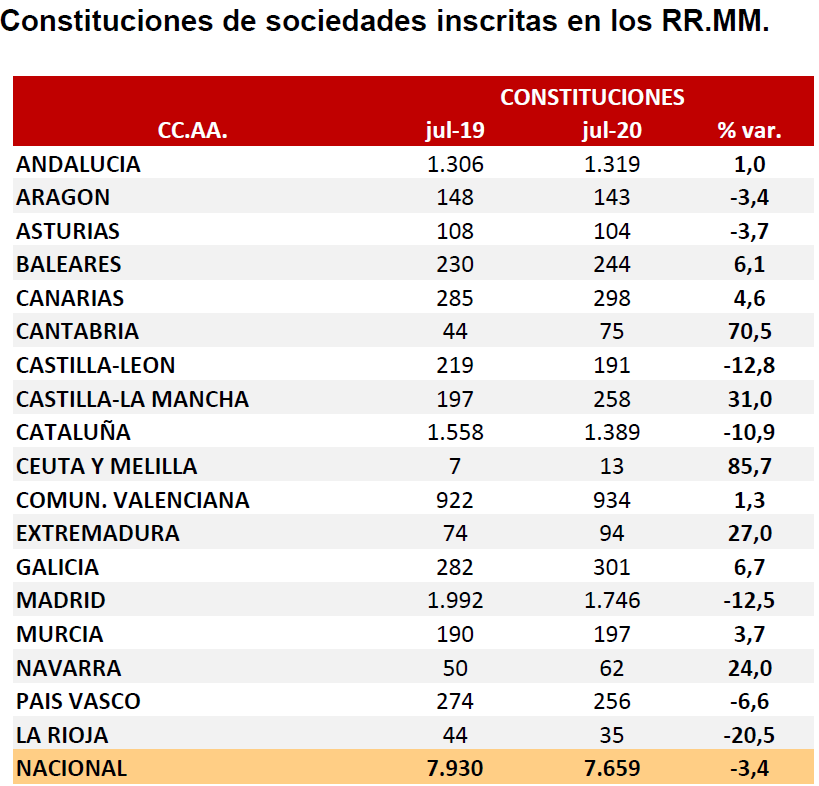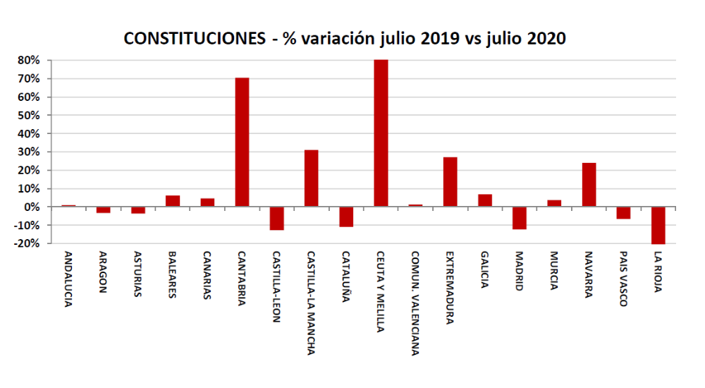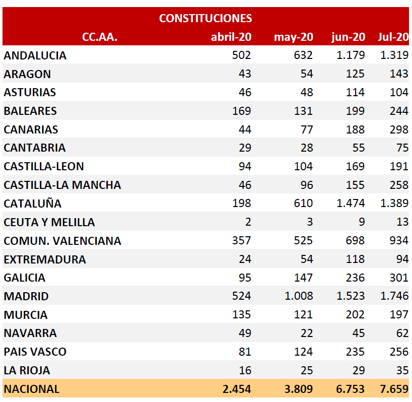 Para observar la evolución durante los últimos meses, se han comparado las constituciones desde abril hasta el mes de julio, observándose un claro incremento durante junio y julio, permitiendo acercarse sustancialmente a los valores del año anterior durante el pasado mes (-3,4%). En líneas generales, las constituciones se han triplicado entre abril y julio, mostrando una mayor intensidad la recuperación producida en junio y especialmente en julio. Por su importancia en términos de volumen de empresas constituidas sobre el total de España, destacan las subidas de Andalucía y Cataluña, que superan las 1.300 constituciones, cuando en abril apenas llegaban a las 500 y 200 respectivamente, y sobre todo, la subida de Madrid que ha triplicado ampliamente en julio las escasas 524 constituciones del mes de abril.