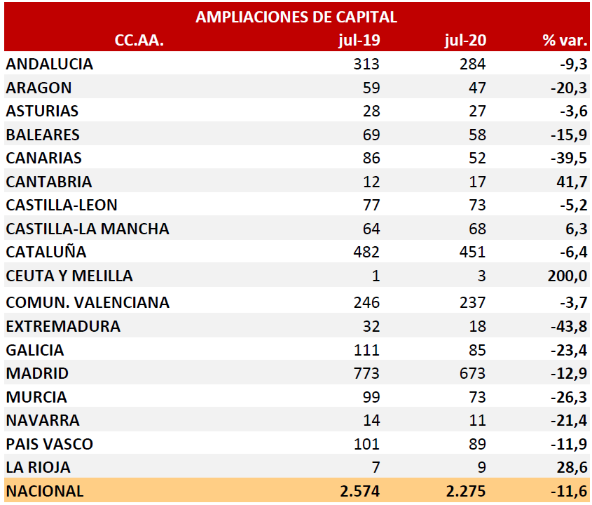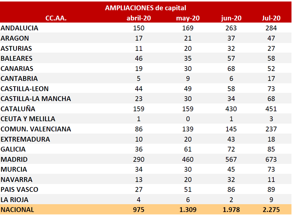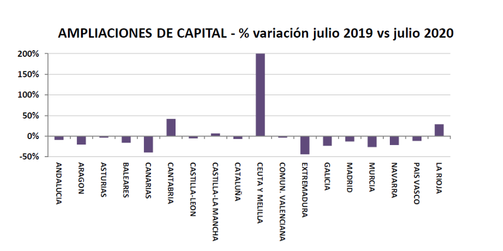 Las operaciones de ampliaciones de capital inscritas en los Registros Mercantiles reflejan de modo directo la apuesta de los propietarios sobre sus proyectos empresariales. Como tendencia general, tal y como se muestra en la tabla posterior, que compara los valores de julio de este año con los mismos del año anterior, destacan los descensos del número de ampliaciones de capital en catorce CC.AA.