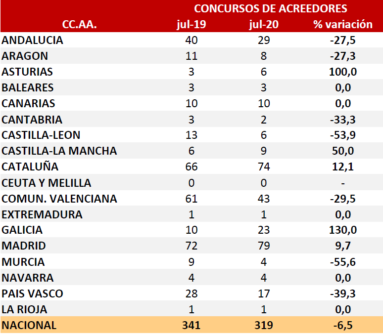 • Los concursos de acreedores inscritos descendieron el 6,5% anual en julio