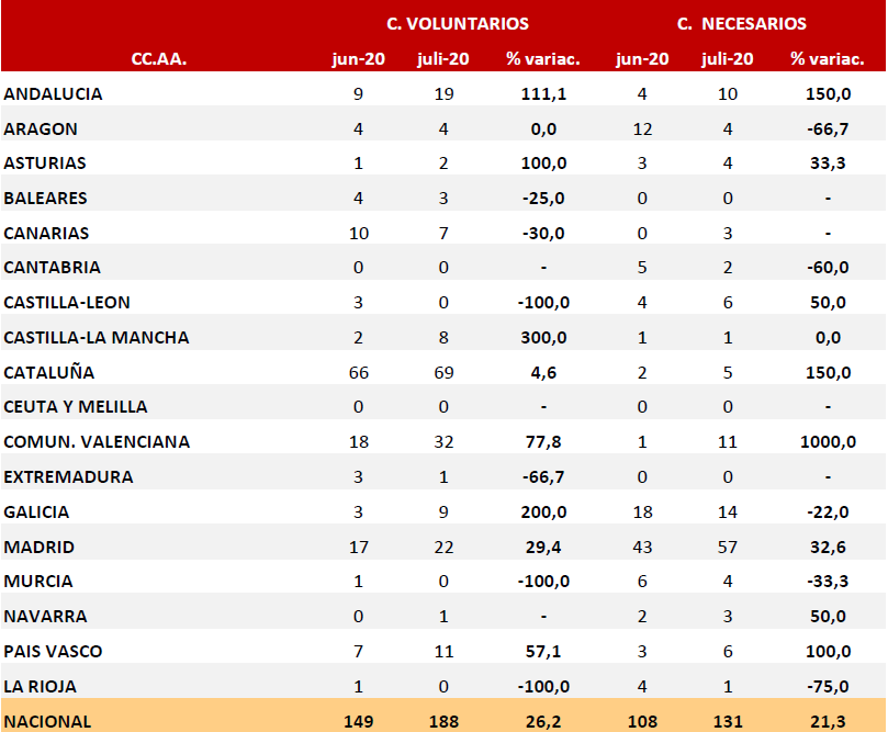 Como se puede apreciar en la tabla anterior, durante el mes de julio se tiende a la situación de normalidad anterior a la pandemia, después de unos meses muy afectados por el impacto del estado de alarma sobre las actividades no esenciales. La caída más acusada se produjo en abril, con descensos del 72,1% en relación al mismo mes del año anterior. Mayo continuó con fuertes descensos, registrando una caída del 56,4%. En los meses de junio y julio comienza claramente la recuperación con caídas más moderadas del 10,0% y del 3,4% respectivamente.