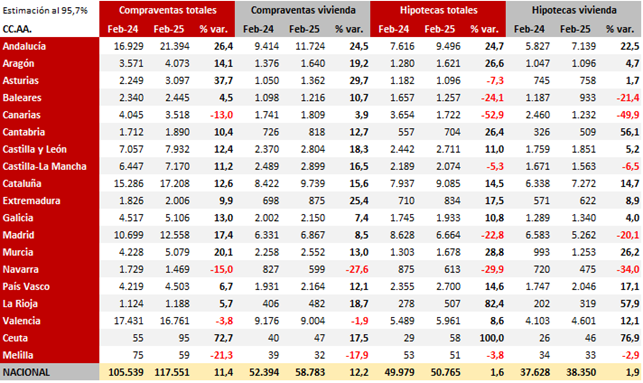 Quince de las diecinueve comunidades y ciudades autónomas registraron incrementos de compraventas totales durante el mes de febrero. Los mayores aumentos se han observado en Ceuta (72,7%), Asturias (37,7%) y Andalucía (26,4%). En el lado opuesto, sólo se produjeron descensos en Melilla (-21,3%) y en tres comunidades autónomas: Navarra (-15,0%), Canarias (-13,0%) y Valencia (-3,8%). En cuanto a compraventas de vivienda, los mayores incrementos se han registrado en Asturias (29,7%), Extremadura (25,4%) y Andalucía (24,5%); y los únicos descensos se dieron en Navarra (-27,6%), Melilla (-17,9%) y Valencia (-1,9%).